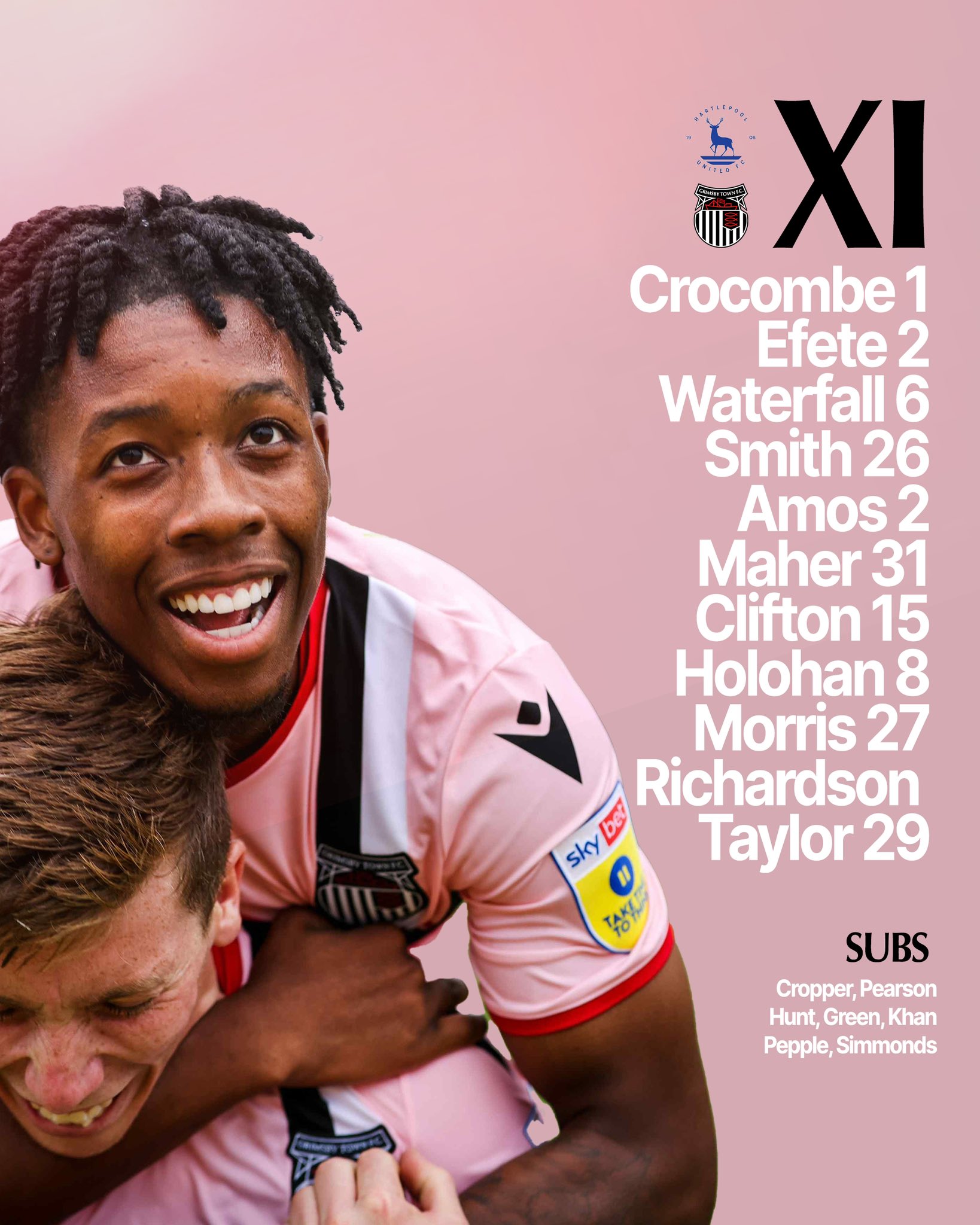 Grimsby (3-5-2): 1. Max Crocombe – 6. Luke Waterfall, 26. Andy Smith, 31. Niall Maher (11. Otis Khan 85′) – 2. Michee Efete, 15. Harry Clifton, 8. Gavan Holohan, 27. Bryn Morris (21. Keke Simmonds 85′), 22. Danny Amos – 19. Lewis Richardson (4. Kieran Green 70′), 29. Ryan Taylor (23. Bim Pepple 63′). Innbyttere: 5. Shaun Pearson, 16. Alex Hunt, 32. Jordan Cropper.