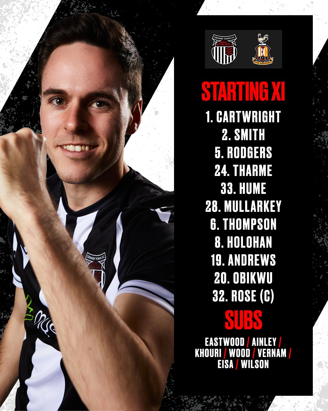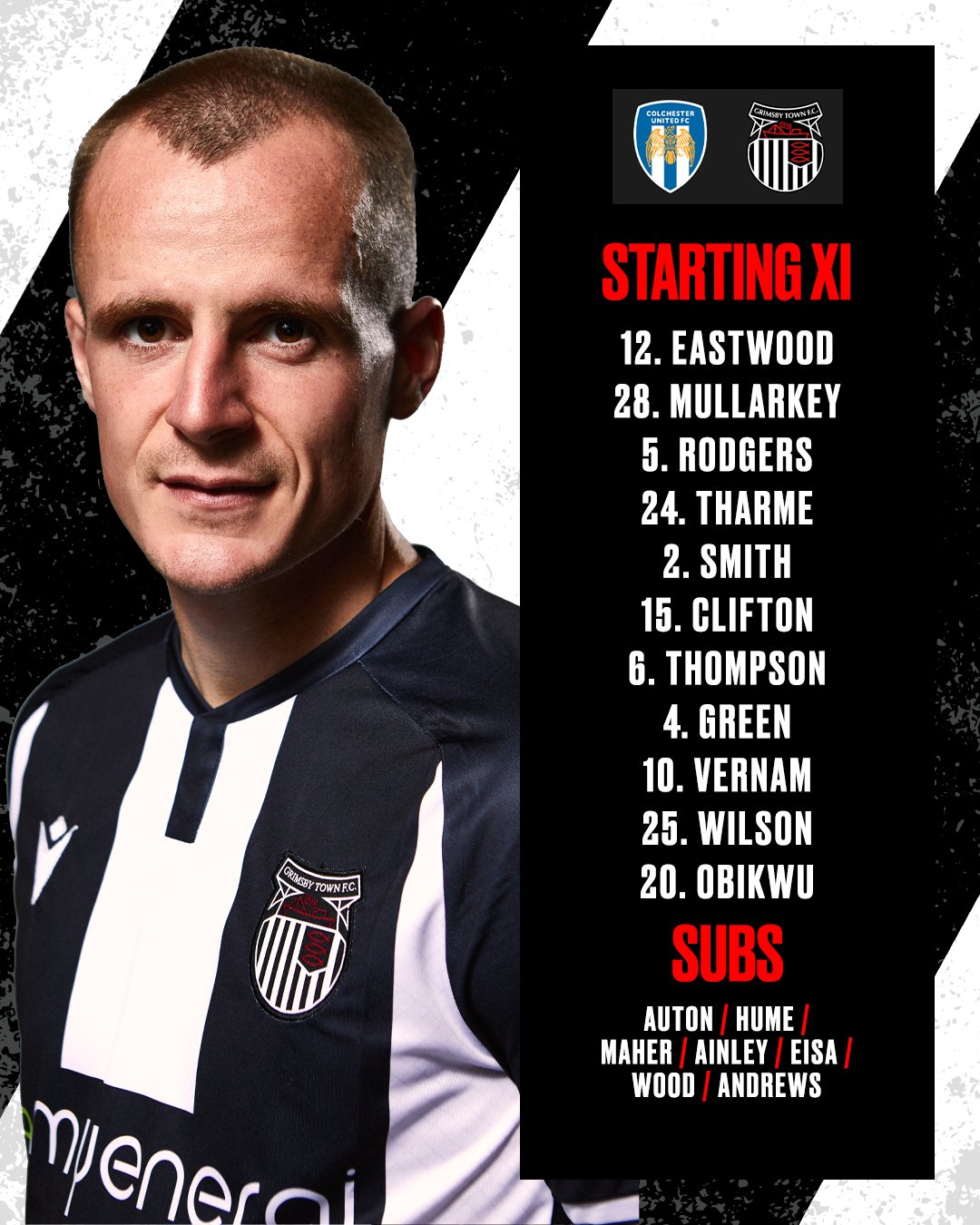 Grimsby måtte gjøre endringer her. Eastwood kommer inn i målet for en skadd Cartwright, mens Vernam erstatter en suspendert Hume. Samtidig kommer Green og Wilson inn for Andrews og Obikwu da Grimsby gjør fire endringer.
