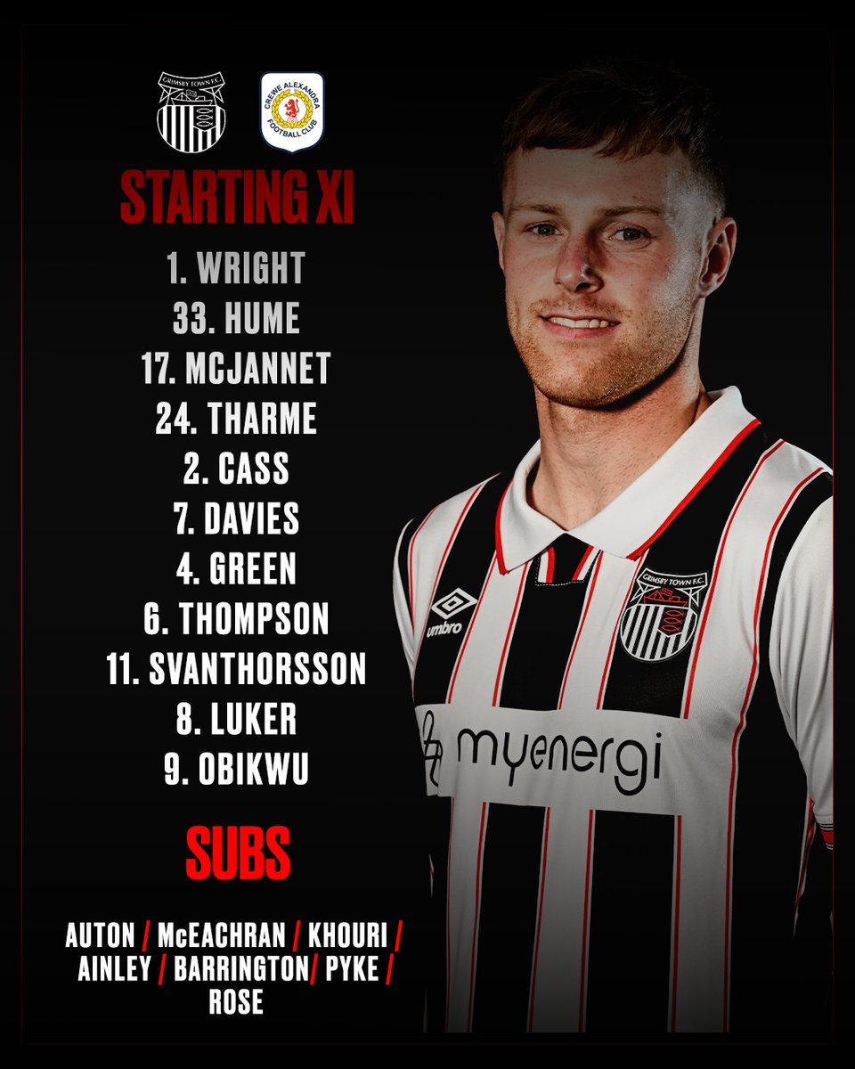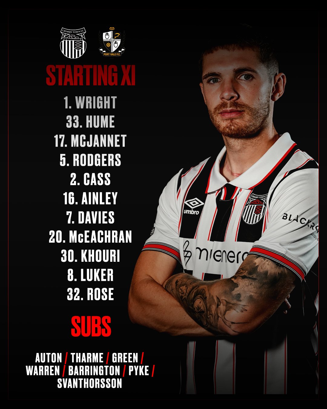 Grimsby (4-3-3): 1. Jordan Wright – 2. Lewis Cass, 5. Harvey Rodgers, 17. Cameron McJannet, 33. Denver Hume – 4. Kieran Green (7. Jordan Davies 83′), 20. George McEachran, 30. Evan Khouri – 8. Jayden Luker (14. Luca Barrington 83′), 22. Cameron Gardner (32. Danny Rose 59′), 16. Callum Ainley (11. Jason Dadi Svanthorsson 68′). Innbyttere: 15. Rekeil Pyke, 24. Doug Tharme, 41. Seb Auton.
