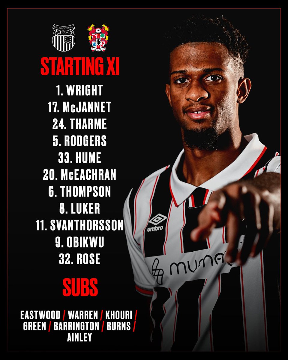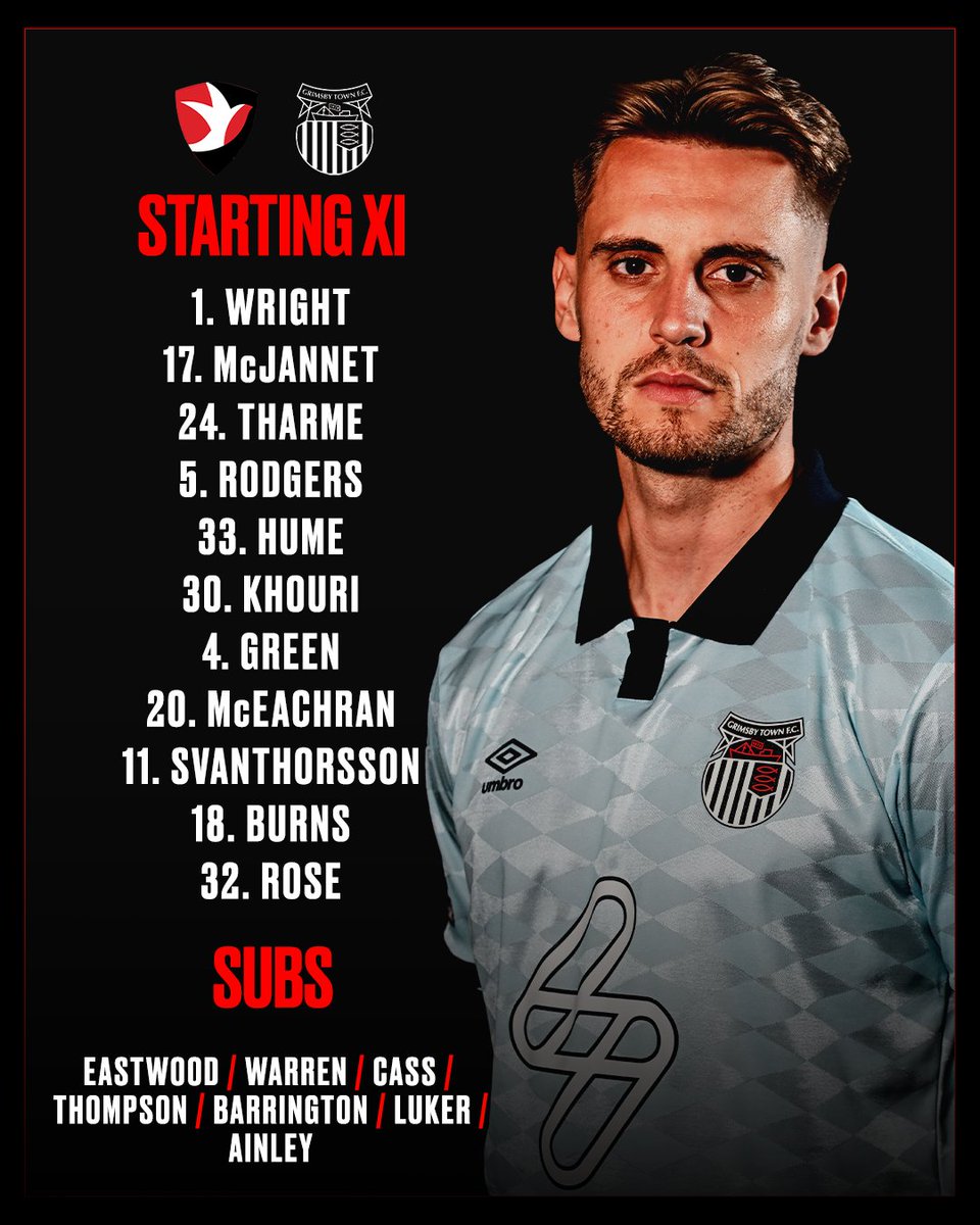 Grimsby (3-5-2): 1. Jordan Wright – 5. Harvey Rodgers, 24. Doug Tharme, 21. Tyrell Warren – 11. Jason Dadi Svanthorsson, 4. Kieran Green (7. Jordan Davies 77′), 20. George McEachran (6. Curtis Thompson 88′), 30. Evan Khouri, 33. Denver Hume – 32. Danny Rose (C), 14. Luca Barrington (8. Jayden Luker 88′). Innbyttere: 12. Jake Eastwood, 17. Cameron McJannet, 18. Darragh Burns, 19. Geza David Turi.