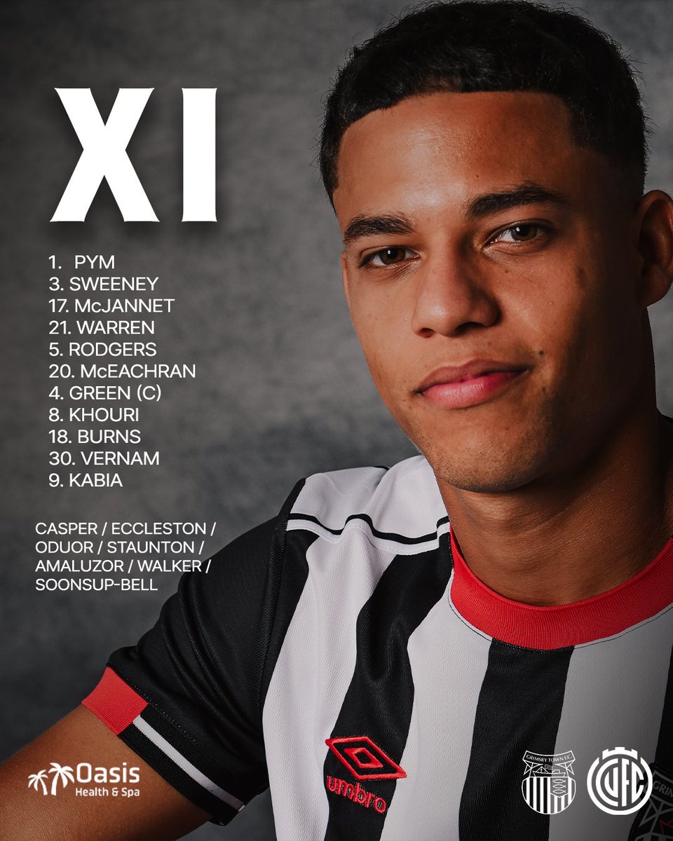 Grimsby (4-3-3): 1. Christy Pym – 5. Harvey Rodgers, 21. Tyrell Warren (10. Jude Soonsup-Bell 88′), 17. Cameron McJannet, 3. Jayden Sweeney (16. Reece Staunton 64′) – 4. Kieran Green (C), 20. George McEachran, 8. Evan Khouri (7. Jamie Walker 75¨’) – 18. Darragh Burns (29. Clarke Odour 75′), 9. Jaze Kabia, 30. Charles Vernam (14. Justin Amaluzor 64′). Innbyttere: 33. Charlie Casper, 12. Neo Eccleston.
